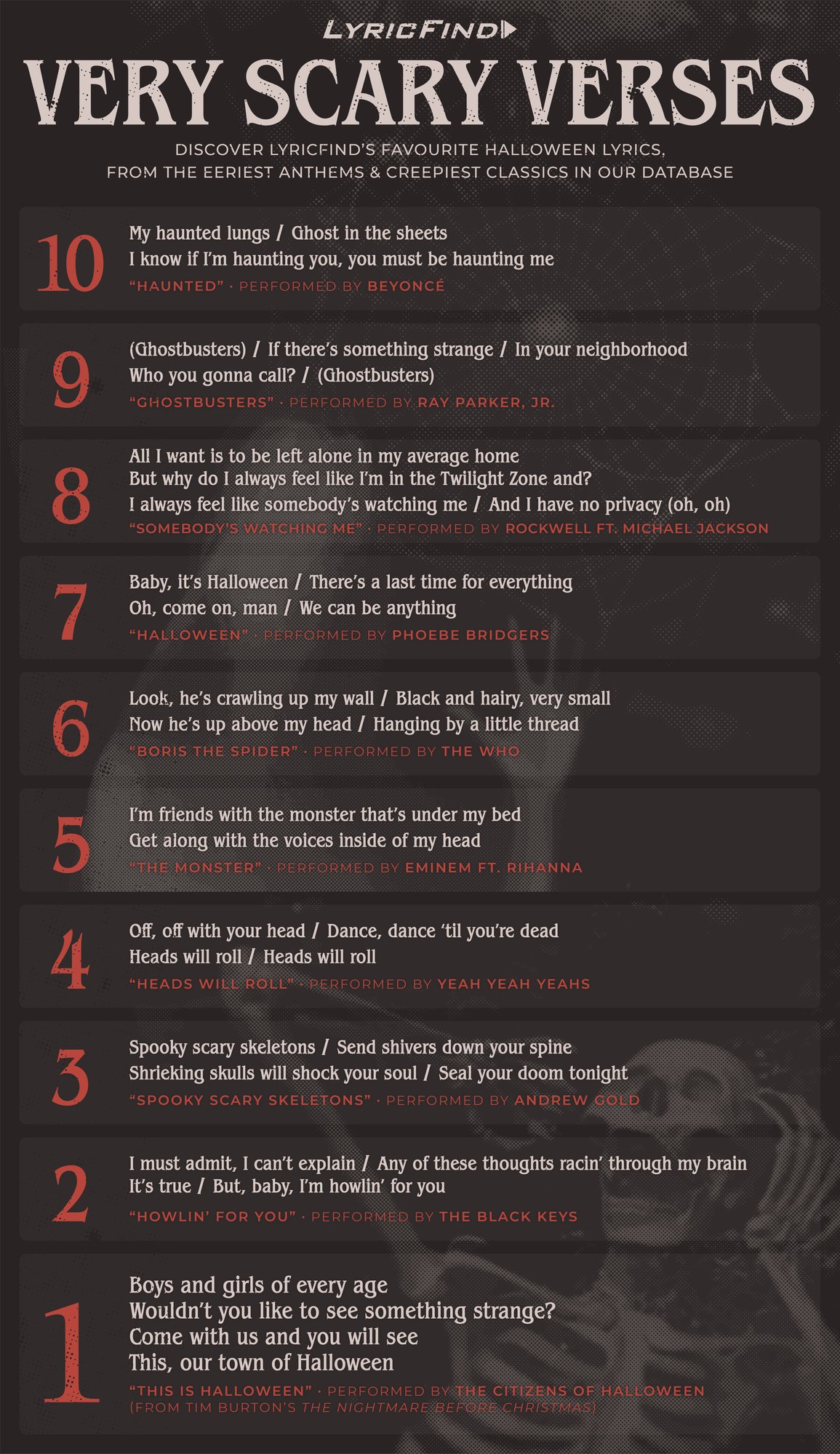 So, from seasons past to new hits, we put together a list of our favourite lyrics from the spookiest songs in our database to fuel this month’s celebrations. Beware: these creepy classics and eerie anthems are scary good.